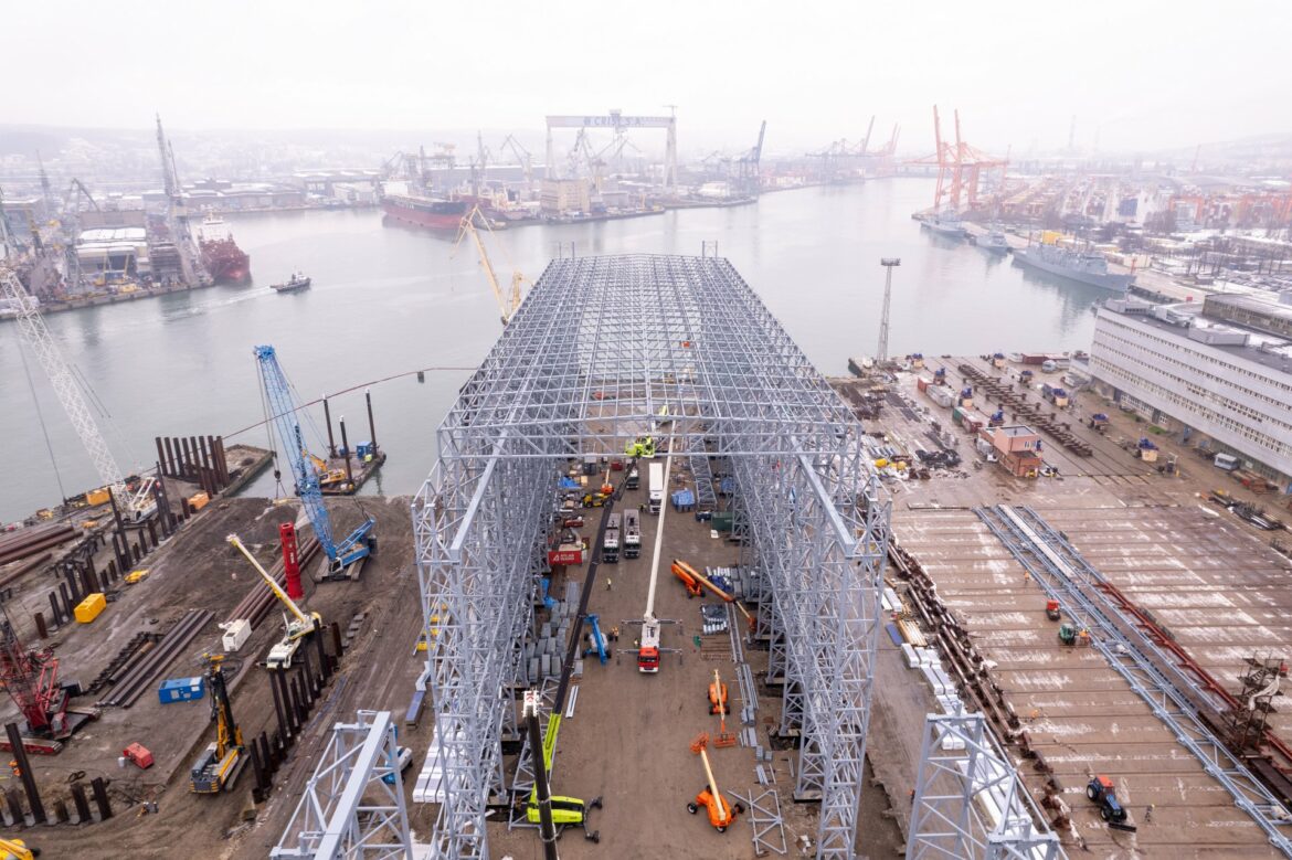 A topping-out ceremony was held at the PGZ Naval Shipyard in Gdynia for the Hull Hall. This is part of an investment worth more than PLN 300 million related to the realisation of the largest contract in the history of the Polish Navy for the construction of three multi-role frigates “Miecznik”. Construction of the halls will be completed in mid-2024.